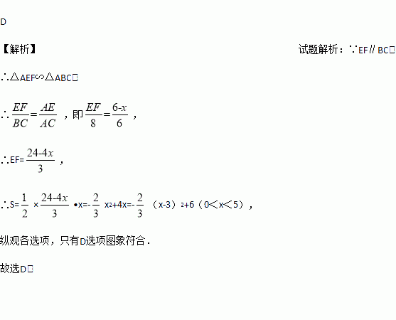 已知:在Rt△ABC中,∠C=900,AC=6,BC=8,点E是边AC上一动点,过点E作EF∥BC,交AB边于点F,点D为BC上任一点,连接DE、DF,设EC长为x,则△DEF面积y关于x的函数图象大致为:( )