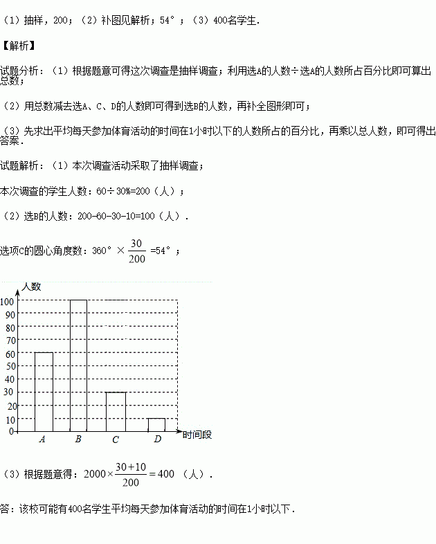(3)若该校有2000名学生,你估计该校可能有多少名学生平均每天参加体育活动的时间在0.5小时以下?