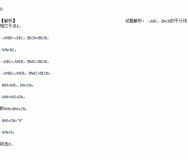 如图,在△ABC中,∠ABC和∠ACB的平分线交于点E,过点E作MN∥BC交AB于M,交AC于N,若BM+CN=9,则线段MN的长为( )