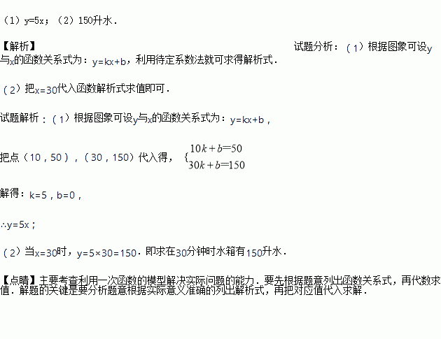 求:(1)y与x之间的函数关系式;(2)在(1)的条件下,30分钟时水箱中的水量是多少?