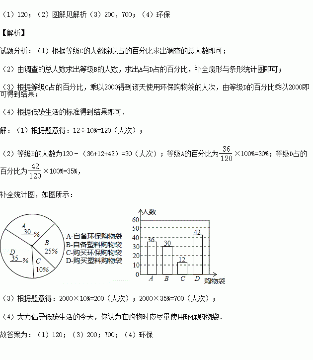 (3)若当天到该超市购物者共有2000人次,请你估计该天使用环保购物袋有 人次,使用塑料购物袋有 人次;