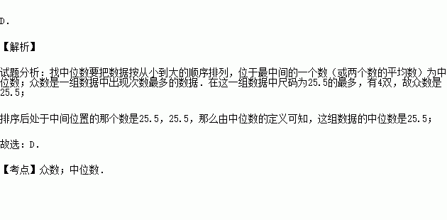 在九龙坡区中学生初中组篮球比赛中,我校篮球队取得了全区第一名的好成绩,为了参加此次比赛,校篮球队准备购买10双运动鞋,各种尺码的统计如表所示,则这10双运动鞋尺码的众数和中位数分别为( )