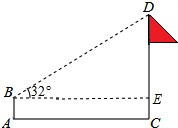 分析 根据题意得AC=22米,AB=1.5米,过点B做BE⊥CD,交CD于点E,利用∠DBE=32°,得到DE=BEtan32°后再加上CE即可求得CD的高度.