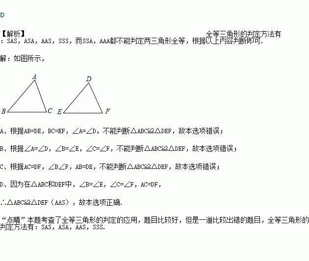 C. ∠A=∠D,∠B=∠E,∠C=∠F D. ∠B=∠E,∠C=∠F,AC=DF
