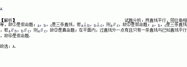 ①同位角相等;②a,b,c是三条直线,若a⊥b,b⊥c,则a⊥c;③a,b,c是三条直线,若a∥b,b∥c,则a∥c;④过一点有且只有一条直线与已知直线平行.