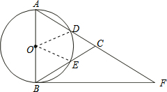 (2)连接DO,EO,根据题意证明△AOD是等边三角形,得到△ABC是等边三角形,根据勾股定理求出BF的长,根据扇形面积公式:$\frac{nπ{r}^{2}}{360}$求出扇形DOE的面积;