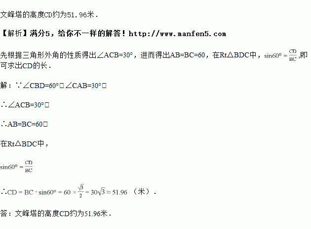 许昌文峰塔又称文明寺塔,为全国重点文物保护单位,某校初三数学兴趣小组的同学想要利用学过的知识测量文峰塔的高度,他们找来了测角仪和卷尺,在点A处测得塔顶C的仰角为30°,向塔的方向移动60米后到达点B,再次测得塔顶C的仰角为60°,试通过计算求出文峰塔的高度CD.(结果保留两位小数)