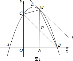 (2)△BOC面积不变,故当M点离直线BC最远时,四边形OBMC的面积最大,可求得直线BC的解析式,则过M且与直线BC平行的直线与抛物线只有一个交点时,M离直线BC的距离最远,可求得M点的坐标,则可求得BN、PN和PB,可求得答案;