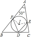 分析:首先利用三角形内角和定理求出∠A的度数,再运用切线的性质,连接IF,IE,可得IF⊥AB,IE⊥AC,又因为,∠A=50°,根据四边形内角和定理,得出∠FIE=130°,再根据圆周角定理得出∠EDF=65°.