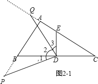(2)如图2,当P点在AB上时,由∠PDQ=90°就可以得出∠2=∠4,就可以证明△PBD∽△QED,就可以EQ的值,从而求得CQ的值;如图2-1,当P点在AB的延长线上时,证明△PBD∽△QED,由相似三角形的性质就可以求出结论;