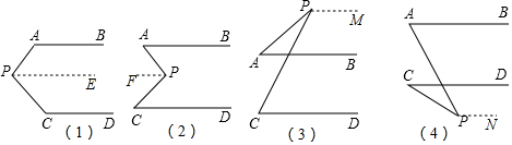 分析 (1)过点P作PE∥AB,则PE∥CD,根据平行线的性质可得∠APE+∠PAB=180°、∠CPE+∠PCD=180°,再根据∠APC=∠APE+∠CPE即可得出∠APC=360°-∠PAB-∠PCD;