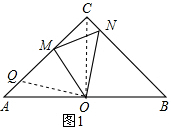 分析:(1)连接CO,在线段AM上截取AQ=CN,连接OQ,由O为CA、CB的垂直平分线的交点,根据线段垂直平分线上的点到线段两端点的距离相等,得到OA=OB=OC,又AC=BC得到∠A=∠B=45°,再根据三线合一的性质得到CO与AB垂直且CO为顶角的平分线,由∠A和∠B求出∠ACB为直角,得到∠OCB也为45°,利用SAS得到三角形AOQ与三角形CON全等,根据全等三角形的对应边相等,对应角相等得到OQ=ON,∠AOQ=∠CON,等量代换得到∠QON为直角,又∠MON为45°,所以∠QOM也为45°,得两角相等,然后由OQ=ON,求出的两角相等,OM为公共边,利用SAS得到三角形OQM与三角形MON全等,根据全等三角形的对应边相等得到QM=MN,由AM=AQ+QM,等量代换即可得证;