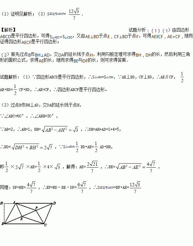如图,一块平行四边形场地ABCD,测得∠ABC=60°,AB=2,AD=4,AE⊥BD于点E,CF⊥BD于点F,连接CE,AF。现计划在四边形AECF区域内种植花草;