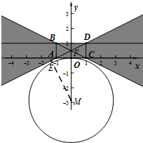 (3)分为两种情况:①⊙M和直线AC相切于(0,0),②与直线BD相切于(0,1),点M在y轴上,⊙M上只有一个点为T1-T2联络点,得出阴影部分关于y轴对称,作ME⊥AD于E,设AD与BC的交点为F,在Rt△AOF中,∠AOF=90°,AO=1,$OF=\frac{1}{2}$,求出AF,在Rt△FEM中,∠FEM=90°,FM=FO+OM=r+$\frac{1}{2}$,$sin∠EFM=sin∠AFO=\frac{{2\sqrt{5}}}{5}$,求出ME,即可求出r的范围.