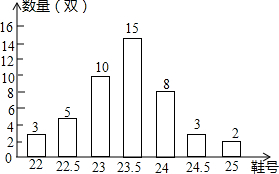 | 数量(双) | 3 | 5 | 10 | 15 | 8 | 3 | 2 |