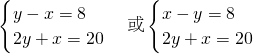 分析:设腰长为ycm,底边长为xcm,根据两边的差是8cm建立方程y-x=8或x-y=8,由周长为20cm得2y+x=20建立两个方程组求出其解即可.
