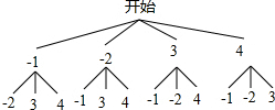 由树状图知共有12种情况,满足b2≥4k,或b2≤-4k的有(-1,-2),(-2,-1),(3,-1),(3,-2),(4,-1),(4,-2),(4,3)7种情况,