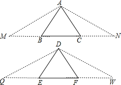 分析:延长BC到N,使AC=CN,延长CB到M,使BM=AB,连接AN、AM,延长EF到W,使DF=FW,延长FE到Q,使EQ=DE,连接DQ、DW,求出MN=QW,∠M=∠Q=∠N=∠W,∠MAB=∠QDE,根据ASA推出△AMN≌△DQW,求出DQ=AM,再根据ASA推出△ABM≌△DEQ,求出AB=DE,AC=DF,根据全等三角形的判定推出即可.