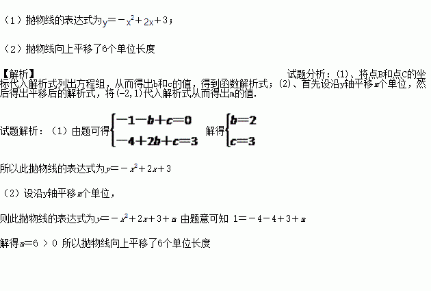 已知:抛物线y=-x2+bx+c经过点B(-1,0)和点C(2,3).(1)求此抛物线的表达式;(2)如果此抛物线沿y轴平移一次后过点(-2,1),试确定这次平移的方向和距离.