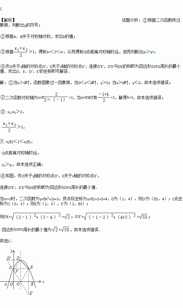 如图,抛物线y=-x2+2x+m+1交x轴于点A(a,0)和B(b,0),交y轴于点C,抛物线的顶点为D,下列四个判断:①当x>0时,y>0;②若a=-1,则b=4;③抛物线上有两点P(x1,y1)和Q(x2,y2),若x1<1< x2,且x1+x2>2,则y1> y2;④点C关于抛物线对称轴的对称点为E,点G,F分别在x轴和y轴上,当m=2时,四边形EDFG周长的最小值为