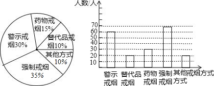 (2)根据题意得:警示戒烟的人数为200×30%=60(人),药物戒烟的人数为200×15%=30(人),其他戒烟的人数为200-(60+20+30+70)=20(人),
