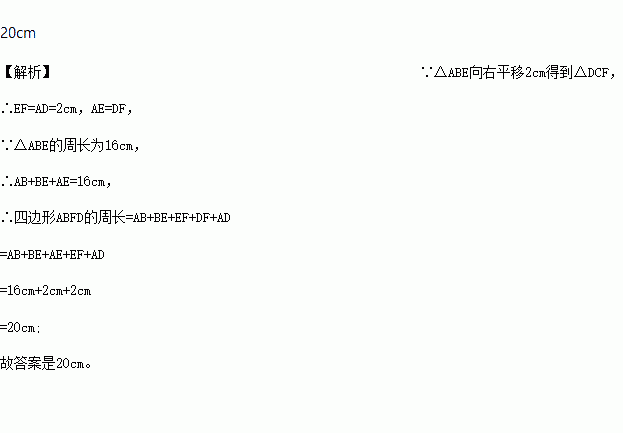 如图,将三角形ABE向右平移2cm得到三角形DCF,如果三角形ABE的周长是16cm,那么四边形ABFD的周长是______________.