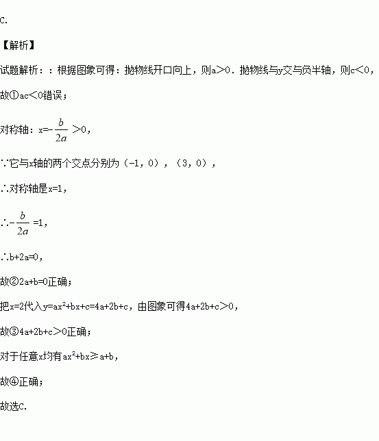 如图,二次函数y=ax2+bx+c的图象与x轴的交点的横坐标分别为-1,3,则下列结论正确的个数有( )①ac<0;②2a+b=0;③4a+2b+c>0;④对于任意x均有ax2+bx≥a+b.