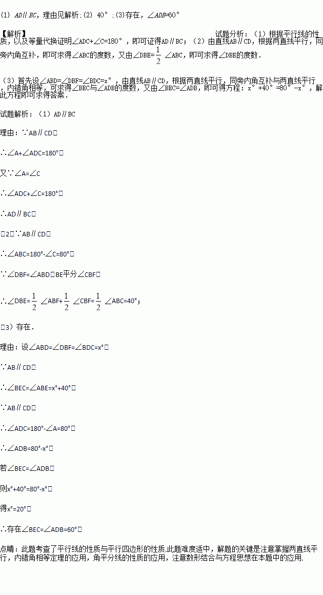 (3)若把AD左右平行移动,在平行移动AD的过程中,是否存在某种情况,使∠BEC=∠ADB?若存在,求出此时∠ADB的度数;若不存在,请说明理由.