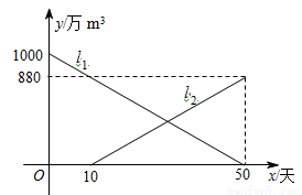 由于持续高温和连日无雨,某水库的蓄水量随时间的增加而减少.已知原有蓄水量y1(万m3)与干旱持续时间x(天)的关系如图中线段l1所示.针对这种干旱情况,从第10天开始向水库注水,注水量y2(万m3)与时间x(天)的关系如图中线段l2所示(不考虑其它因素).