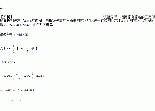 如图,D,E分别是△ABC边AB,BC上的点,AD=2BD,BE=CE,设△ADF的面积为S1,△FCE的面积为S2,若S△ABC=6,则S1-S2的值为_________.