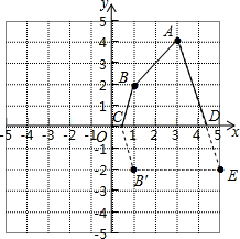 作B点关于x轴对称点B′(1,-2),将B′向右平移4个单位到E(5,-2),