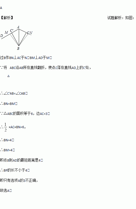 如图,△ABC的面积为6,AC=3,现将△ABC沿AB所在直线翻折,使点C落在直线AD上的C′处,P为直线AD上的一点,则线段BP的长不可能是( )
