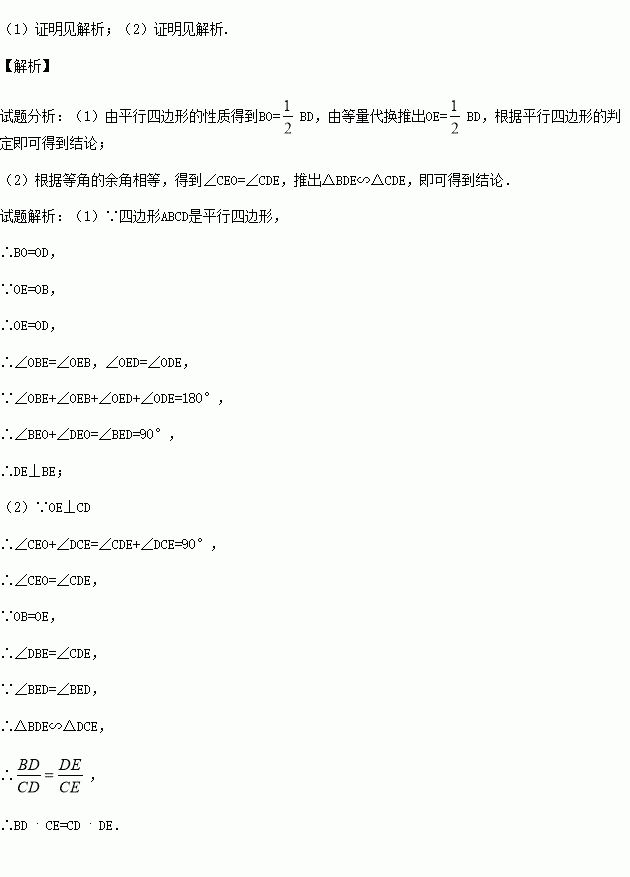 已知:如图,平行四边形ABCD的对角线相交于点O,点E在边BC的延长线上,且OE=OB,联结DE.