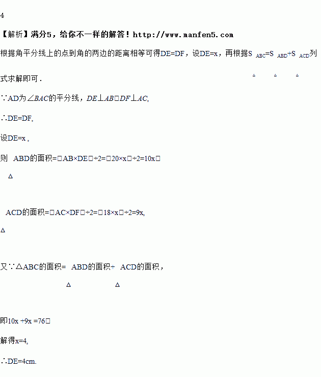 如图,在△ABC中,AD为∠BAC的平分线,DE⊥AB于E,DF⊥AC于F,△ABC面积是76cm2,AB=20cm,AC=18cm,求DE的长.