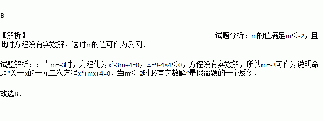能说明命题“关于x的一元二次方程x2+mx+4=0,当m<﹣2时必有实数解”是假命题的一个反例为( )