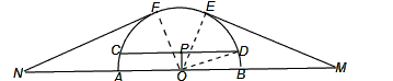 某河道上有一个半圆形的拱桥,河两岸筑有拦水堤坝,其半圆形桥洞的横截面如图所示.已知上、下桥的坡面线ME、NF与半圆相切,上、下桥斜面的坡度i=1∶3.7,桥下水深OP=5米,水面宽度CD=24米.设半圆的圆心为O,直径AB在坡角顶点M、N的连线上,求从M点上坡、过桥、下坡到N点的最短路径长.(参考数据:π≈3,