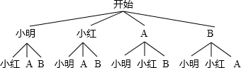 所有可能出现的结果是:(小明,小红),(小明、A),(小明,B),(小红,小明),(小红,A),(小红,B),(A,小明),(A,小红),(A,B),(B,小明),(B,小红),(B,A),