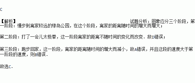 小华的爷爷每天坚持体育锻炼,某天他慢步到离家较远的绿岛公园,打了一会儿太极拳后跑步回家.下面能反映当天小华的爷爷离家的距离y与时间x的函数关系的大致图象是( ).