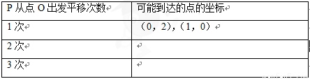 在平面直角坐标系中描出点P从点O出发,平移1次后,2次后,3次后可能到达的点,并把相应点的坐标填写在表格中:
