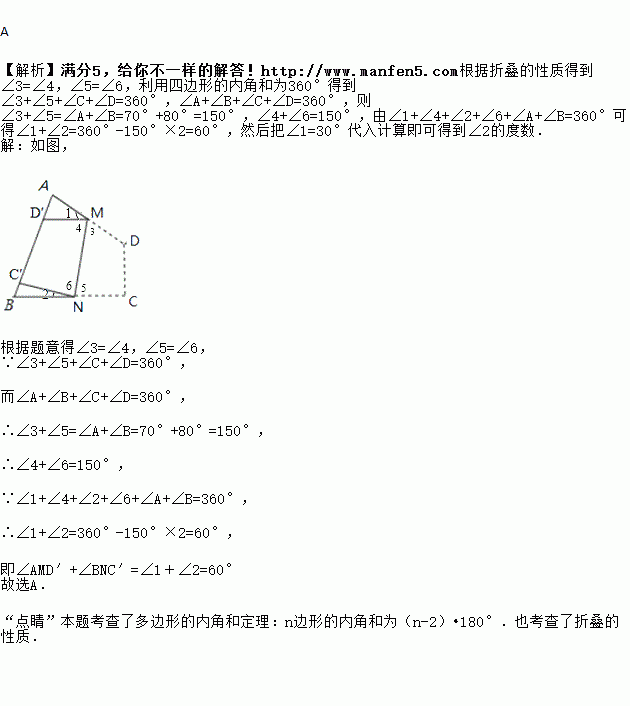 如图,四边形纸片ABCD中,∠A=70°,∠B=80°,将纸片折叠,使C,D落在AB边上的C′,D′处,折痕为MN,则∠AMD′+∠BNC′=( ).
