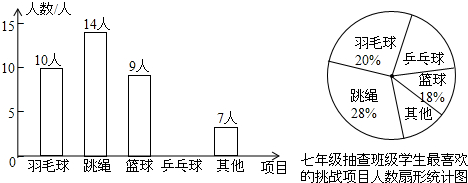 10.某校欲举办“校园吉尼斯挑战赛”,为此该校在七年级中随机抽取一个班级进行了一次“你最喜欢的挑战项目”的问卷调查,已知被调查的班级的学生人数为50,根据收集到的数据,绘制成如下统计图表(不完整),