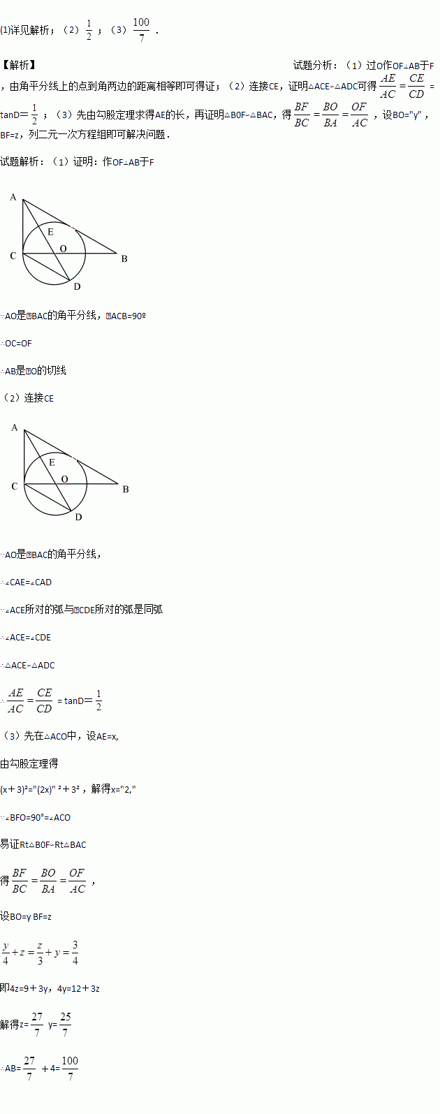 (3)在(2)的条件下,设⊙O的半径为3,求AB的长.