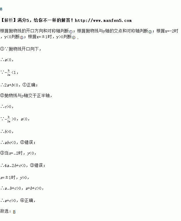 已知二次函数y=ax2+bx+c(a≠0)的图象如图所示,下列结论:①2a+b<0;②abc>0;③4a?2b+c>0;④a+c>0,其中正确结论的个数为( )