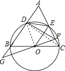 (2)在等边三角形ODE中,由于DF⊥EO,得到∠EDF=∠ODF,推出△DEF≌△DOF,证得∠DEF=∠DOF,于是得到∠AED=∠DOG=∠DBO通过△DOB∽△DGO,得到$\frac{OD}{DG}=\frac{DB}{OD}$求得OD=$\sqrt{13}$,BC=2$\sqrt{13}$,在Rt△BDC中,DC=$\sqrt{{2}^{2}+(2\sqrt{13)^{2}}}$=4$\sqrt{3}$,由于△ADE∽△ACB,得到$\frac{AD}{AC}=\frac{AE}{AB}$求得AE=3,EC=5,由于△FEO∽△OEF,得到$\frac{OE}{EC}=\frac{EF}{OE}$求得EF=$\frac{13}{5}$,于是得到CF=EC-EF=5-$\frac{13}{5}$=$\frac{12}{5}$.
