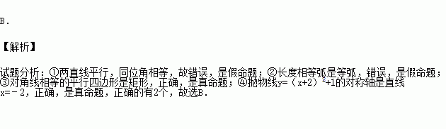 以下命题:①同位角相等;②长度相等弧是等弧;③对角线相等的平行四边形是矩形;④抛物线y=(x+2)2+1的对称轴是直线x=﹣2.其中真命题的个数是( )