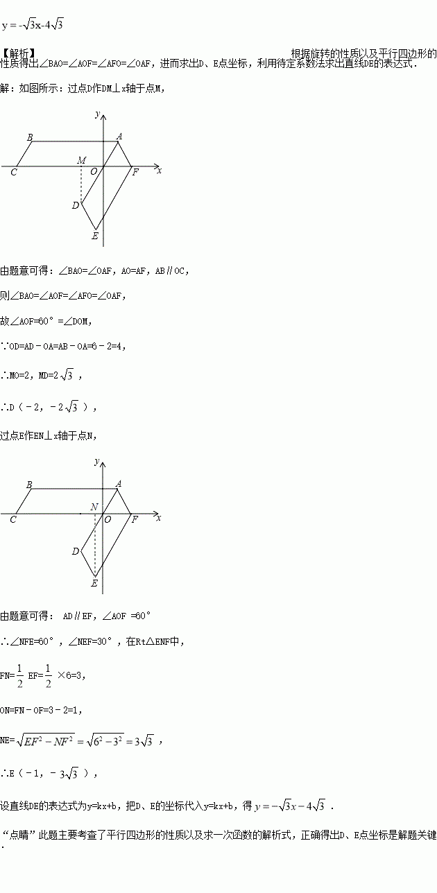 如图,四边形ABCD是平行四边形,OA=2,AB=6点C在x轴的负半轴上,将平行四边形ABCO绕点A逆时针旋转得到平行四边形ADEF,点D在直线AO上,点F在x轴的正半轴上,则直线DE的表达式__________________.