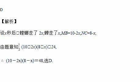 如图,AB⊥BC,AB=10 cm,BC=8 cm,一只蝉从C点沿CB方向以每秒1 cm的速度爬行,蝉开始爬行的同时,一只螳螂由A点沿AB方向以每秒2 cm的速度爬行,当螳螂和蝉爬行x秒后,它们分别到达了M,N的位置,此时,△MNB的面积恰好为24 cm2,由题意可列方程( )