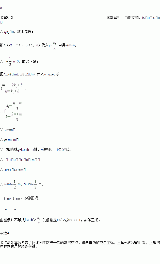 的图像相交于A(-2,m)、B(1,n)两点,连接OA、OB. 给出下列结论: ①k1k2<0;②m+