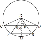 分析 过点O作OM⊥CD于点N,交⊙O于点M,根据垂径定理得出$\widehat{CM}$=$\widehat{DM}$,即可得出$\widehat{AM}$=$\widehat{BM}$,根据等腰三角形的三线合一的性质得OE=OF.
