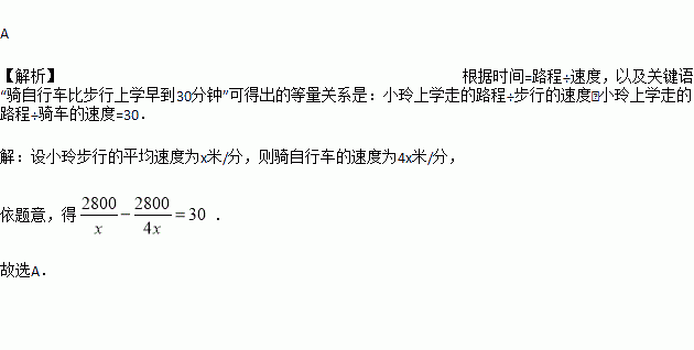 小玲每天骑自行车或步行上学,她上学的路程为2800米,骑自行车的平均速度是步行平均速度的4倍,骑自行车比步行上学早到30分钟.设小玲步行的平均速度为x米/分,根据题意,下面列出的方程正确的是( )